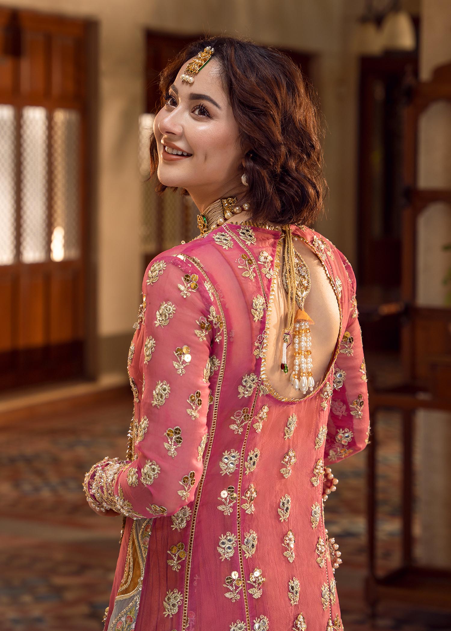 Dupatta: Ready-to-wear Dupatta featuring stunning 4-side Foil Work and Heavy Tassels (Latkans) that add a luxurious weight and movement to the outfit.